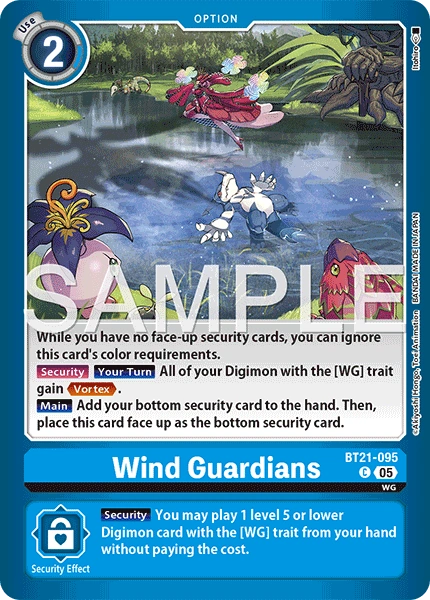 [Security] You may play 1 [WG] trait level 5 or lower Digimon card from your hand without paying the cost.Wind Guardians BT21-095 C WG While you have no face-up security cards, you can ignore this card's color requirements. (Security) [All Turns] All of your [WG] trait Digimon gain <Vortex>. [Main] Add your bottom security card to the hand. Then, place this card face up as the bottom security card. --- [Security] You may play 1 level 5 or lower Digimon with the [WG] trait from your hand without paying the cost.