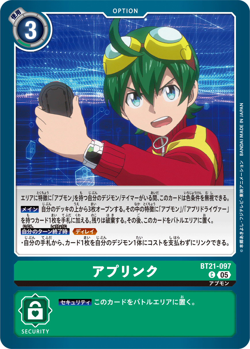 アプリンク BT21-097 C アプモン エリアに特徴に「アプモン」を持つ自分のデジモン/テイマーがいる間、このカードは色条件を無視できる。 【メイン】自分のデッキの上から3枚オープンする。その中の特徴に「アプモン」/「アプリドライヴァー」を持つカード1枚を手札に加える。残りは破棄する。その後、このカードをバトルエリアに置く。 【自分のターン終了時】≪ディレイ≫ • 自分の手札から、カード1枚を自分のデジモン1体にコストを支払わずにリンクできる。 --- 【セキュリティ】このカードをバトルエリアに置く。