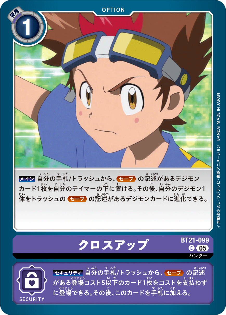 クロスアップ BT21-099 C ハンター 【メイン】自分の手札/トラッシュから、≪セーブ≫の記述があるデジモンカード1枚を自分のテイマーの下に置ける。その後、自分のデジモン1体をトラッシュの≪セーブ≫の記述があるデジモンカードに進化できる。 --- 【セキュリティ】自分の手札/トラッシュから、≪セーブ≫の記述がある登場コスト5以下のカード1枚をコストを支払わずに登場できる。その後、このカードを手札に加える。