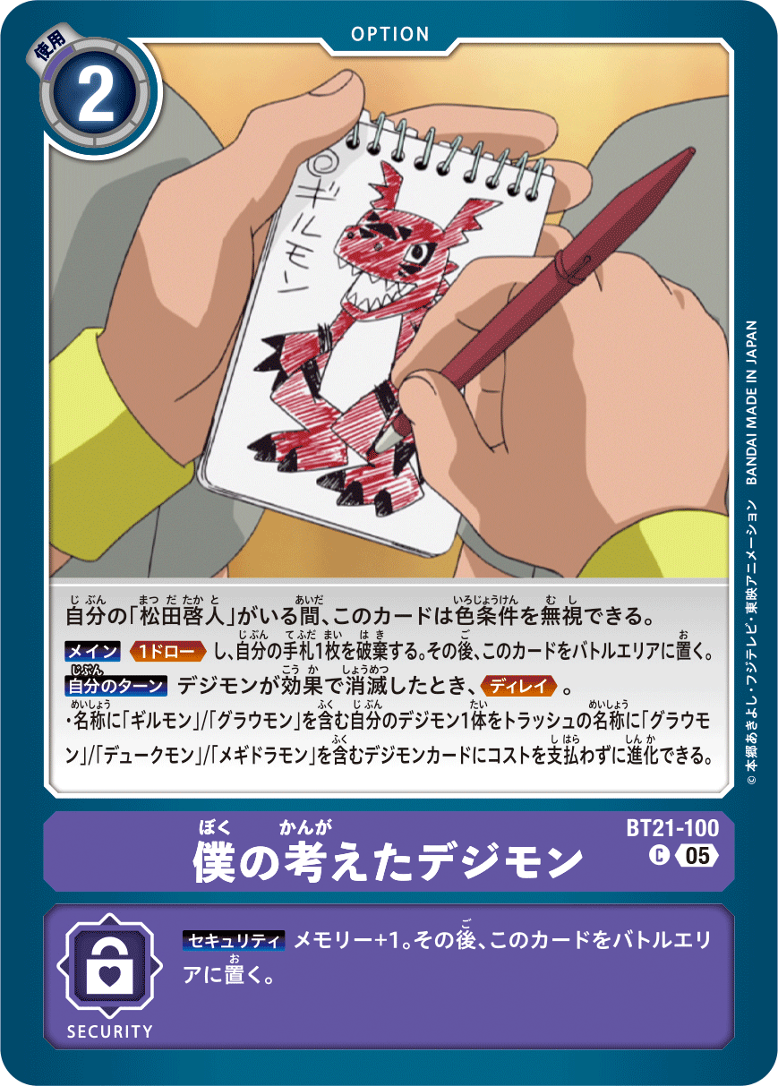 僕の考えたデジモン BT21-100 C 自分の「松田啓人」がいる間、このカードは色条件を無視できる。 【メイン】≪1ドロー≫し、自分の手札1枚を破棄する。その後、このカードをバトルエリアに置く。 【自分のターン】デジモンが効果で消滅したとき、≪ディレイ≫。 • 名称に「ギルモン」/「グラウモン」を含む自分のデジモン1体をトラッシュの名称に「グラウモン」/「デュークモン」/「メギドラモン」を含むデジモンカードにコストを支払わずに進化できる。 --- 【セキュリティ】メモリー+1。その後、このカードをバトルエリアに置く。