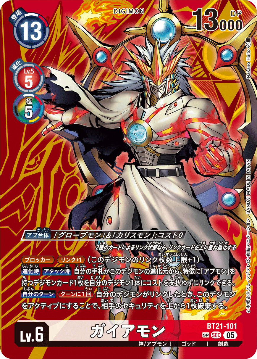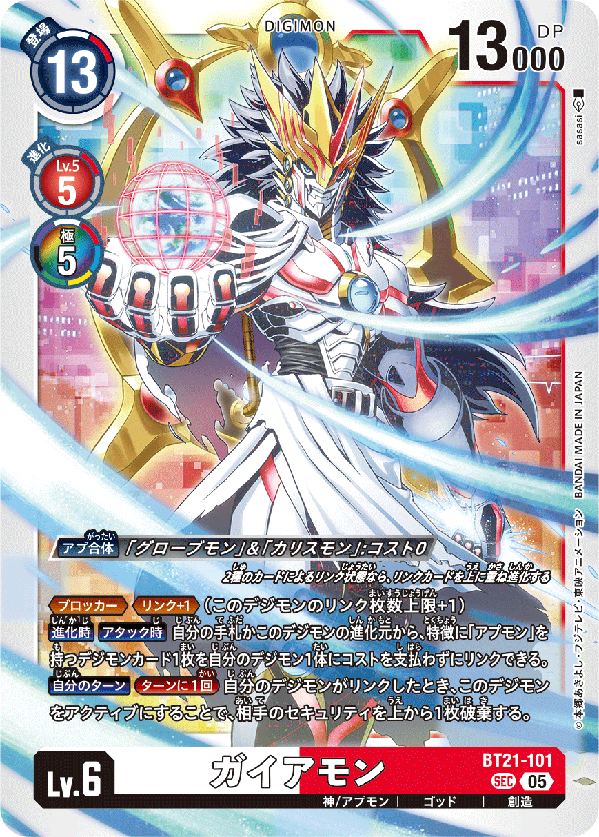 Lv.6 Gaiamon BT21-101 SEC God/Appmon | God | Creation [App Fusion] [Globemon] & [Charismon]: Cost 0 <Blocker> <Link +1> [When Digivolving] [When Attacking] You may link 1 Digimon card with the [Appmon] trait from your hand or this Digimon's digivolution cards to 1 of your Digimon without paying the cost. [Your Turn] [Once Per Turn] When your Digimon get linked, by unsuspending this Digimon, trash your opponent's top security card.