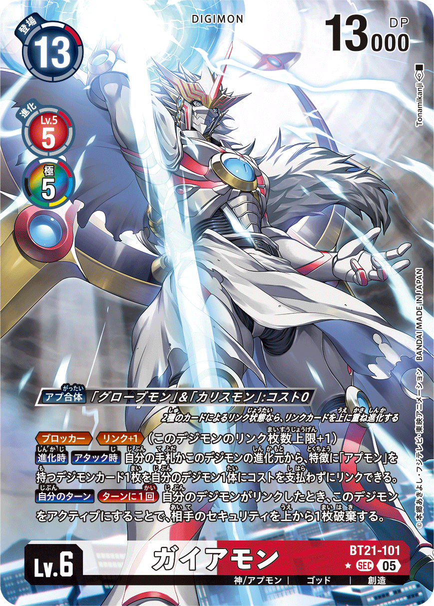 Lv.6 ガイアモン BT21-101 SEC 神/アプモン | ゴッド | 創造 ≪ブロッカー≫≪リンク+1≫(このデジモンのリンク枚数上限+1) 【進化時】【アタック時】自分の手札かこのデジモンの進化元から、特徴に「アプモン」を持つデジモンカード1枚を自分のデジモン1体にコストを支払わずにリンクできる。 【自分のターン】[ターンに1回]自分のデジモンがリンクしたとき、このデジモンをアクティブにすることで、相手のセキュリティを上から1枚破棄する。 ---