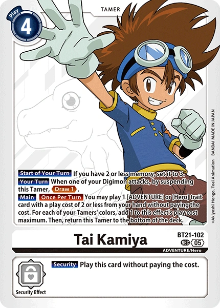 Tai Kamiya BT21-102 SEC ADVENTURE/Hero [Start of Your Turn] If you have 2 or less memory, set it to 3. [Your Turn] When one of your Digimon attacks, by suspending this Tamer, <Draw 1>. [Main] [Once Per Turn] You may play 1 [ADVENTURE] or [Hero] trait card with a play cost of 2 or less from your hand without paying the cost. For each of your Tamers' colors, add 1 to this effect's play cost maximum. Then, return this Tamer to the bottom of the deck. --- [Security] Play this card without paying the cost.