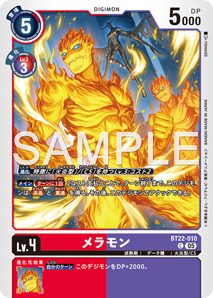 Lv.4 メラモン BT22-010 C 成熟期 | データ種 | 火炎型/CS 【メイン】[ターンに1回]2コスト支払うことで、ターン終了まで、このデジモンは≪突進≫と≪貫通≫を得る。その後、このデジモンでアタックできる。 --- 【自分のターン】このデジモンをDP+2000。