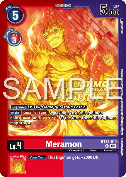 Lv.4 Meramon BT22-010 C Champion | Data | Flame/CS [Digivolve] Lv.3 w/[Flame]/[CS] trait: Cost 2 [Main] [Once Per Turn] By paying 2 cost, this Digimon gains <Raid> and <Piercing> for the turn. Then, this Digimon may attack. --- [Your Turn] This Digimon gets +2000 DP.