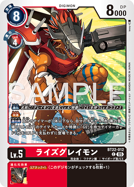 Lv.5 ライズグレイモン BT22-012 C 完全体 | ワクチン種 | サイボーグ型/CS ≪突進≫ 【進化時】自分のテイマーが1体以下なら、自分の手札から、赤/黒の登場コスト4以下のテイマーカードか特徴に「CS」を持つテイマーカード1枚をコストを支払わずに登場できる。 --- ≪Sアタック+1≫(このデジモンがチェックする枚数+1)