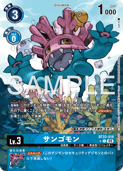 Lv.3 サンゴモン BT22-018 C 成長期 | データ種 | 軟体型/リベレイター 【登場時】このデジモンを特徴に「水棲」を含む他の自分のデジモンの進化元の下に置くことで、相手のターン終了まで、そのデジモンは≪ブロッカー≫を得て、バトルで消滅しない。 〈ルール〉特徴:タイプ「水棲型」を持つ。 --- ≪ジャミング≫(このデジモンはセキュリティデジモンとのバトルで消滅しない)
