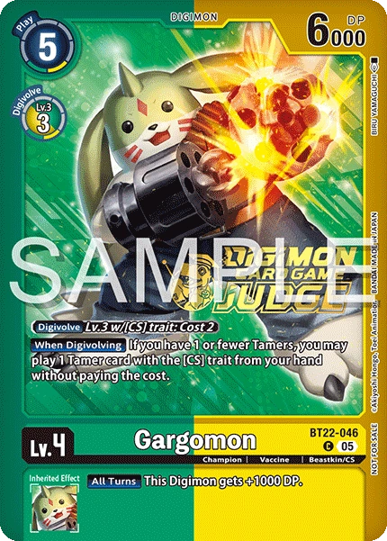 Lv.4 Gargomon BT22-046 C Champion | Vaccine | Beastkin/CS [When Digivolving] If you have 1 or fewer Tamers, you may play 1 Tamer card with the [CS] trait from your hand without paying the cost. --- [All Turns] This Digimon gets +1000 DP.
