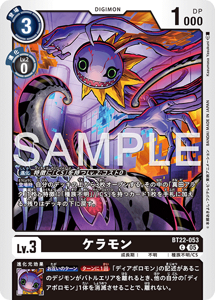 Lv.3 ケラモン BT22-053 C 成長期 | 不明 | 種族不明/CS 【登場時】自分のデッキの上から3枚オープンする。その中の「真田アラタ」1枚と特徴に「種族不明」/「CS」を持つカード1枚を手札に加える。残りはデッキの下に戻す。 --- 【お互いのターン】[ターンに1回]「ディアボロモン」の記述があるこのデジモンがバトルエリアを離れるとき、他の自分の「ディアボロモン」1体を消滅させることで、離れない。