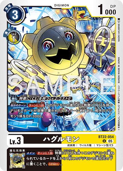 Lv.3 ハグルモン BT22-054 U 成長期 | ウィルス種 | マシーン型/CS 【自分のターン】[ターンに1回]このデジモンの進化元に特徴に「CS」を持つデジモンカードが効果で置かれたとき、ターン終了まで、相手のデジモン1体をDP-3000。 --- 【メイン】[ターンに1回]特徴に「CS」を持つこのデジモンに重ねられているカードを上から1枚このデジモンの進化元の下に置くことで、≪1ドロー≫。