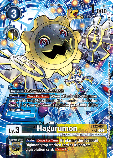 Lv.3 Hagurumon BT22-054 U Rookie | Virus | Machine/CS [Digivolve] Lv.2 w/[CS] trait: Cost 0 [Your Turn] [Once Per Turn] When effects place Digimon cards with the [CS] trait in this Digimon's digivolution cards, 1 of your opponent's Digimon gets -3000 DP for the turn. --- [Main] [Once Per Turn] By placing this [CS] trait Digimon's top stacked card as its bottom digivolution card, <Draw 1>.
