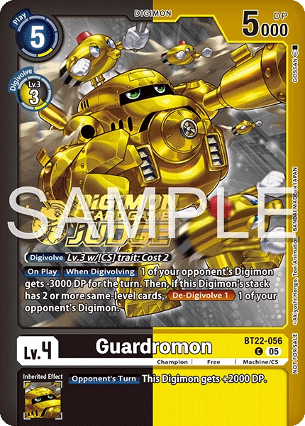 Lv.4 Guardromon BT22-056 C Champion | Free | Machine/CS [On Play] [When Digivolving] 1 of your opponent's Digimon gets -3000 DP for the turn. Then, if this Digimon's stack has 2 or more same-level cards, <De-Digivolve 1> 1 of your opponent's Digimon. --- [Opponent's Turn] This Digimon gets +2000 DP.