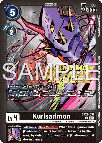 Lv.4 Kurisarimon BT22-057 C Champion | Unknown | Unidentified/CS [When Digivolving] If you have 1 or fewer Tamers, you may play 1 [Arata Sanada] from your hand without paying the cost. --- [All Turns] [Once Per Turn] When this Digimon with [Diaboromon] in its text would leave the battle area, by deleting 1 of your other [Diaboromon], it doesn't leave.