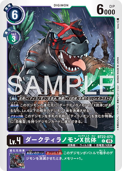 Lv.4 ダークティラノモンX抗体 BT22-070 C 成熟期 | ウィルス種 | 恐竜型/X抗体 【進化時】このデジモンの進化元に「ダークティラノモン」/「X抗体」があるなら、Lv.4以下の相手のデジモン1体を消滅させる。 【アタック時】このデジモンを手札の名称に「ティラノモン」を含むか特徴に「恐竜型」を持つデジモンカードに進化できる。 --- 【お互いのターン】[ターンに1回]このデジモンがバトルで相手のデジモンを消滅させたとき、メモリー+1。