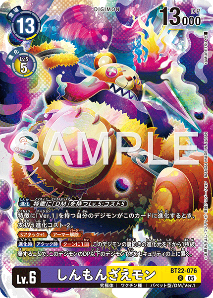 Lv.6 しんもんざえモン BT22-076 R 究極体 | ワクチン種 | パペット型/DM/Ver.1 特徴に「Ver.1」を持つ自分のデジモンがこのカードに進化するとき、支払う進化コスト-2。 ≪Sアタック+1≫≪アーマー解除≫ 【進化時】【アタック時】[ターンに1回]このデジモンの裏向きの進化元を下から1枚破棄することで、このデジモンのDP以下のデジモン1体をセキュリティの上に置く。 ---
