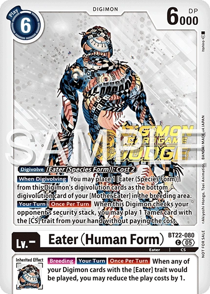 {Breeding} [Your Turn] [Once Per Turn] When any of your Digimon cards with the [Eater] trait would be played, you may reduce the play costs by 1.Lv.- Eater (Human Form) BT22-080 C