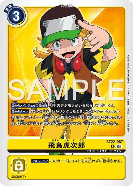 飛鳥虎次郎 BT22-087 R アプリドライヴァー/アプモン 【自分のメインフェイズ開始時】相手のデジモンがいるなら、メモリー+1。 【自分のターン】自分のデジモンがリンクしたとき、このテイマーをレストさせることで、ターン終了まで、相手のデジモン1体をDP-2000。その後、自分のデジモン1体を手札のデジモンカードにアプ合体できる。 --- 【セキュリティ】このカードをコストを支払わずに登場させる。