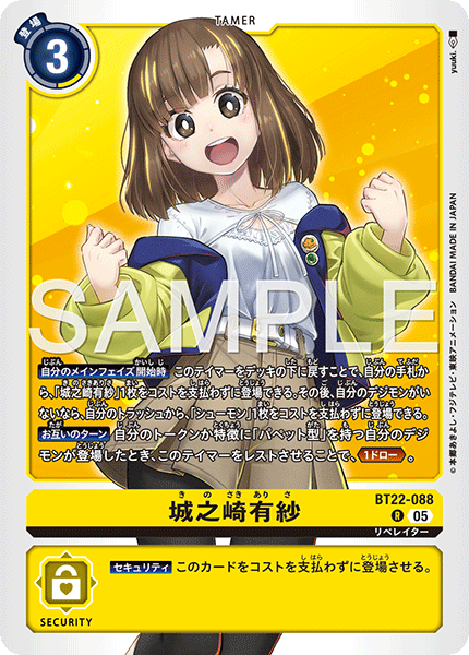 城之崎有紗 BT22-088 R リベレイター 【自分のメインフェイズ開始時】このテイマーをデッキの下に戻すことで、自分の手札から、「城之崎有紗」1枚をコストを支払わずに登場できる。その後、自分のデジモンがいないなら、自分のトラッシュから、「シューモン」1枚をコストを支払わずに登場できる。 【お互いのターン】自分のトークンか特徴に「パペット型」を持つ自分のデジモンが登場したとき、このテイマーをレストさせることで、≪1ドロー≫。 --- 【セキュリティ】このカードをコストを支払わずに登場させる。