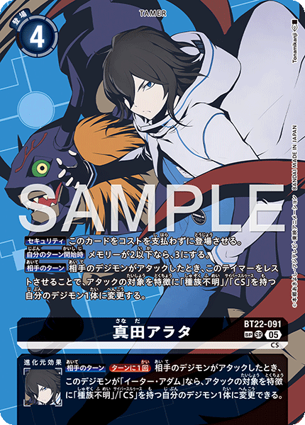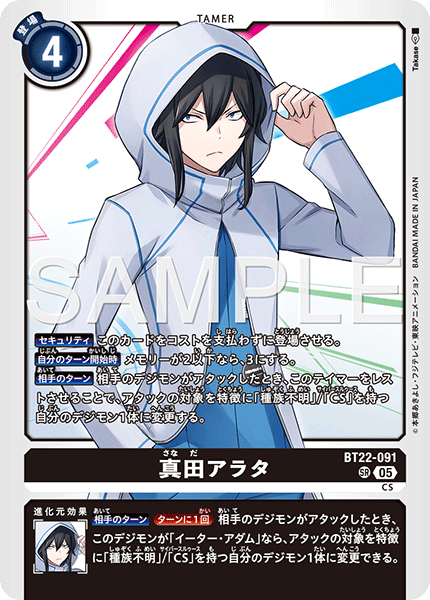 真田アラタ BT22-091 SR CS 【セキュリティ】このカードをコストを支払わずに登場させる。 【自分のターン開始時】メモリーが2以下なら、3にする。 【相手のターン】相手のデジモンがアタックしたとき、このテイマーをレストさせることで、アタックの対象を特徴に「種族不明」/「CS」を持つ自分のデジモン1体に変更する。 --- 【相手のターン】[ターンに1回]相手のデジモンがアタックしたとき、このデジモンが「イーター• アダム」なら、アタックの対象を特徴に「種族不明」/「CS」を持つ自分のデジモン1体に変更できる。
