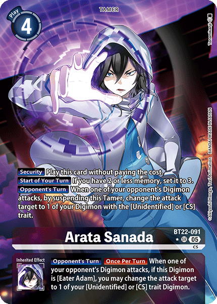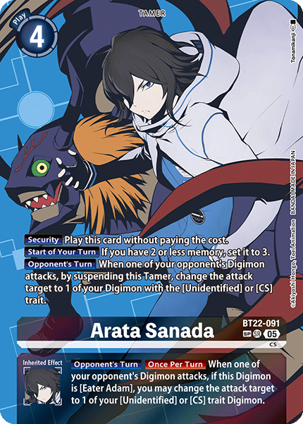 Arata Sanada BT22-091 SR CS [Security] Play this card without paying the cost. [Start of Your Turn] If you have 2 or less memory, set it to 3. [Opponent's Turn] When one of your opponent's Digimon attacks, by suspending this Tamer, change the attack target to 1 of your Digimon with the [Unidentified] or [CS] trait. --- [Opponent's Turn] [Once Per Turn] When one of your opponent's Digimon attacks, if this Digimon is [Eater Adam], you may change the attack target to 1 of your [Unidentified] or [CS] trait Digimon.