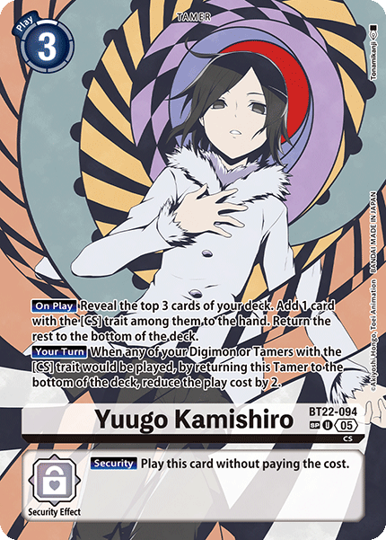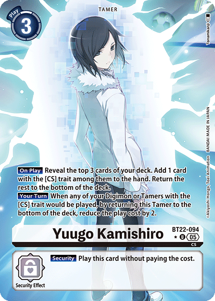 Yuugo Kamishiro BT22-094 U CS [On Play] Reveal the top 3 cards of your deck. Add 1 card with the [CS] trait among them to the hand. Return the rest to the bottom of the deck. [Your Turn] When any of your Digimon or Tamers with the [CS] trait would be played, by returning this Tamer to the bottom of the deck, reduce the play cost by 2. --- [Security] Play this card without paying the cost.