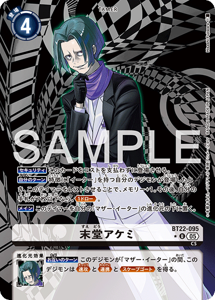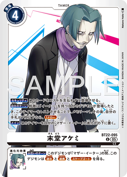 末堂アケミ BT22-095 U CS 【セキュリティ】このカードをコストを支払わずに登場させる。 【自分のターン】特徴に「イーター」を持つ自分のデジモンが登場したとき、このテイマーをレストさせることで、メモリー+1。その後、自分の手札が7枚以下なら、≪1ドロー≫。 【メイン】このテイマーを自分の「マザー• イーター」の進化元の下に置く。 --- 【お互いのターン】このデジモンが「マザー• イーター」の間、このデジモンは≪速攻≫と≪連携≫と≪スケープゴート≫を得る。
