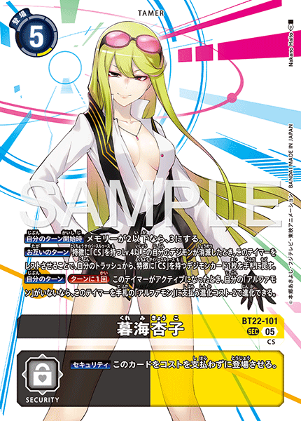 暮海杏子 BT22-101 SEC CS 【自分のターン開始時】メモリーが2以下なら、3にする。 【お互いのターン】特徴に「CS」を持つLv.4以上の自分のデジモンが消滅したとき、このテイマーをレストさせることで、自分のトラッシュから、特徴に「CS」を持つデジモンカード1枚を手札に戻す。 【自分のターン】[ターンに1回]このテイマーがアクティブになったとき、自分の「アルファモン」がいないなら、このテイマーを手札の「アルファモン」に支払う進化コスト-2で進化できる。 --- 【セキュリティ】このカードをコストを支払わずに登場させる。