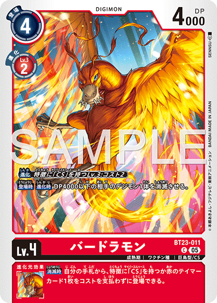 Lv.4 バードラモン BT23-011 C 成熟期 | ワクチン種 | 巨鳥型/CS 【登場時】【進化時】DP4000以下の相手のデジモン1体を消滅させる。 --- 【消滅時】自分の手札から、特徴に「CS」を持つか赤のテイマーカード1枚をコストを支払わずに登場できる。