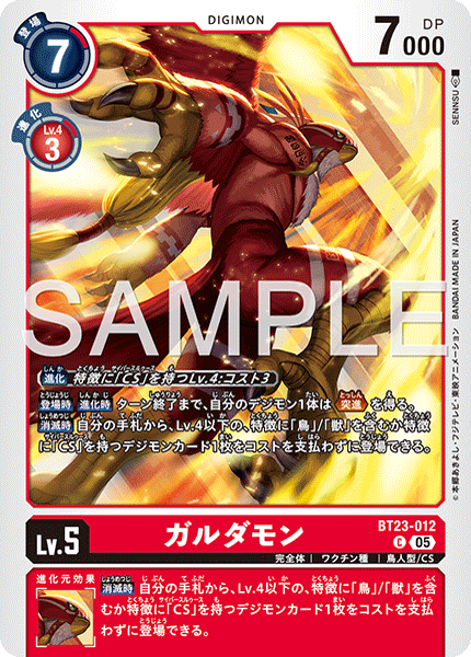 Lv.5 ガルダモン BT23-012 C 完全体 | ワクチン種 | 鳥人型/CS 【登場時】【進化時】ターン終了まで、自分のデジモン1体は≪突進≫を得る。 【消滅時】自分の手札から、Lv.4以下の、特徴に「鳥」/「獣」を含むか特徴に「CS」を持つデジモンカード1枚をコストを支払わずに登場できる。 --- 【消滅時】自分の手札から、Lv.4以下の、特徴に「鳥」/「獣」を含むか特徴に「CS」を持つデジモンカード1枚をコストを支払わずに登場できる。
