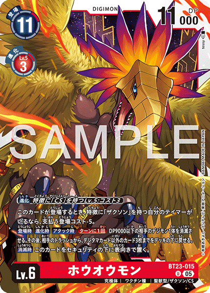 Lv.6 ホウオウモン BT23-015 U 究極体 | ワクチン種 | 聖獣型/ザクソン/CS このカードが登場するとき、特徴に「ザクソン」を持つ自分のテイマーがいるなら、支払う登場コスト-5。 【登場時】【進化時】【アタック時】[ターンに1回]DP9000以下の相手のデジモン1体を消滅させる。その後、相手のトラッシュから、デジタマカード以外のカード3枚までをデッキの下に戻せる。 【消滅時】このカードをセキュリティの下に表向きで置く。 ---