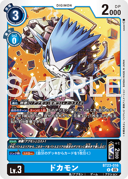 Lv.3 ドカモン BT23-016 R 並/アプモン | ゲーム | アクション 【自分のターン】[ターンに1回]このデジモンがリンクしたとき、自分のテイマーが1体以下なら、自分の手札から、「花嵐エリ」1枚をコストを支払わずに登場できる。 --- 〈リンク〉特徴「アプモン」:コスト1(手札/バトルエリアから、このカードをバトルエリアの指定のデジモンに横向きで差し込む) リンク: +DP+2000DP リンク: 【リンク時】≪1ドロー≫(自分のデッキからカードを1枚引く)