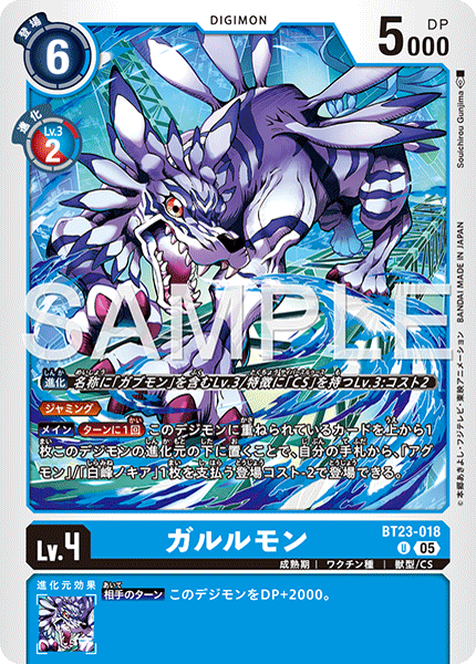 Lv.4 ガルルモン BT23-018 U 成熟期 | ワクチン種 | 獣型/CS ≪ジャミング≫ 【メイン】[ターンに1回]このデジモンに重ねられているカードを上から1枚このデジモンの進化元の下に置くことで、自分の手札から、「アグモン」/「白峰ノキア」1枚を支払う登場コスト-2で登場できる。 --- 【相手のターン】このデジモンをDP+2000。