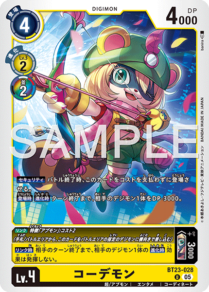 Lv.4 コーデモン BT23-028 U 超/アプモン | エンタメ | コーディネート 【セキュリティ】バトル終了時、このカードをコストを支払わずに登場させる。 【登場時】【進化時】ターン終了まで、相手のデジモン1体をDP-3000。 --- 〈リンク〉特徴「アプモン」:コスト2(手札/バトルエリアから、このカードをバトルエリアの指定のデジモンに横向きで差し込む) リンク: +DP+3000DP リンク: 【リンク時】相手のターン終了まで、相手のデジモン1体の【進化時】効果は発揮しない。