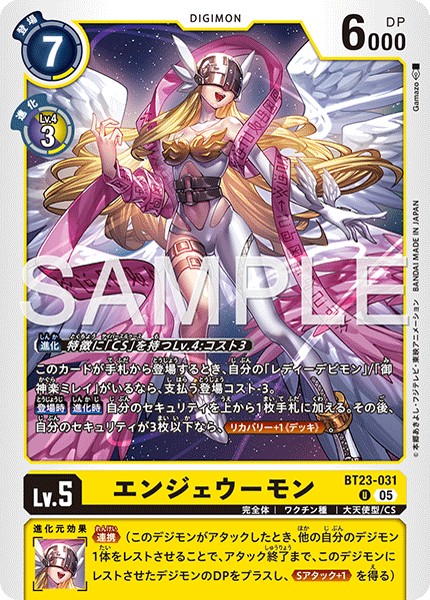 Lv.5 エンジェウーモン BT23-031 U 完全体 | ワクチン種 | 大天使型/CS このカードが手札から登場するとき、自分の「レディーデビモン」/「御神楽ミレイ」がいるなら、支払う登場コスト-3。 【登場時】【進化時】自分のセキュリティを上から1枚手札に加える。その後、自分のセキュリティが3枚以下なら、≪リカバリー+1《デッキ》≫。 --- ≪連携≫(このデジモンがアタックしたとき、他の自分のデジモン1体をレストさせることで、アタック終了まで、このデジモンにレストさせたデジモンのDPをプラスし、≪Sアタック+1≫を得る)