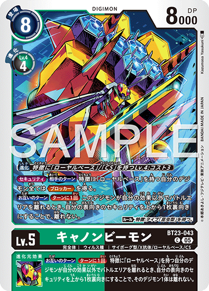 [All Turns] [Once Per Turn] When any of your [Royal Base] trait Digimon would leave the battle area other than by your effects, by flipping your top face-up security card face down, 1 of those Digimon doesn't leave.Lv.5 CannonBeemon BT23-043 C