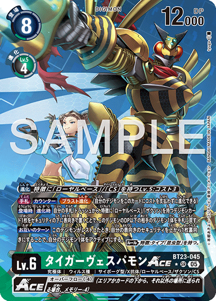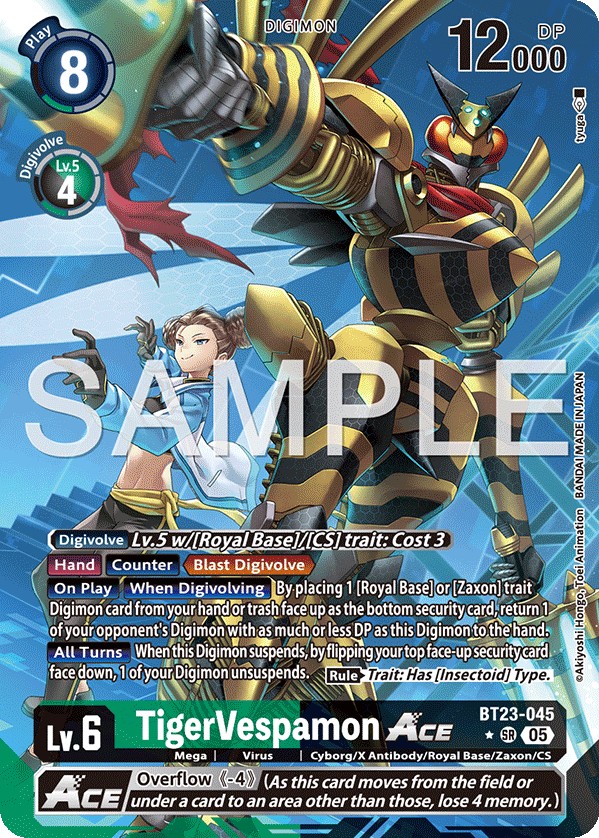 <Overflow (-4)> (As this card moves from the field or under a card to an area other than those, lose 4 memory.)Lv.6 TigerVespamon ACE BT23-045 SR mega | Virus | Cyborg/X Antibody/Royal Base/Zaxon/CS [Digivolve] Lv.5 w/[Royal Base]/[CS] trait: Cost 3 [Hand] [Counter] <Blast Digivolve> (One of your Digimon may digivolve into this card without paying the cost.) [On Play] [When Digivolving] By placing 1 [Royal Base] or [Zaxon] trait Digimon card from your hand or trash face up as the bottom security card, return 1 of your opponent's Digimon with as much or less DP as this Digimon to the hand. [All Turns] When this Digimon suspends, by flipping your top face-up security card face down, 1 of your Digimon unsuspends. (Rule) Trait: Has [Insectoid] Type. --- <Overflow (-4)> (As this card moves from the battle area or under a card to another area, lose 4 memory.)