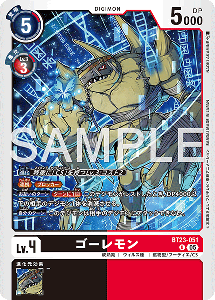 Lv.4 ゴーレモン BT23-051 U 成熟期 | ウィルス種 | 鉱物型/フーディエ/CS ≪連携≫≪ブロッカー≫ 【お互いのターン】[ターンに1回]このデジモンがレストしたとき、DP4000以下の相手のデジモン1体を消滅させる。 【自分のターン】このデジモンは相手のデジモンにアタックできない。 ---