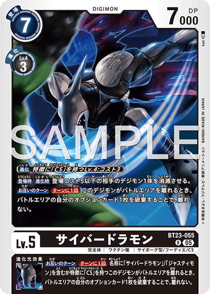 Lv.5 サイバードラモン BT23-055 R 完全体 | ワクチン種 | サイボーグ型/フーディエ/CS 【登場時】【進化時】登場コスト5以下の相手のデジモン1体を消滅させる。 【お互いのターン】[ターンに1回]このデジモンがバトルエリアを離れるとき、バトルエリアの自分のオプションカード1枚を破棄することで、離れない。 --- 【お互いのターン】[ターンに1回]名称に「サイバードラモン」/「ジャスティモン」を含むか特徴に「CS」を持つこのデジモンがバトルエリアを離れるとき、バトルエリアの自分のオプションカード1枚を破棄することで、離れない。