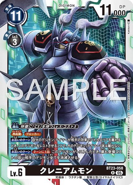 Lv.6 クレニアムモン BT23-058 R 究極体 | ワクチン種 | 聖騎士型/ロイヤルナイツ/CS ≪再起動≫≪ブロッカー≫ 【お互いのターン】自分のデジモン/テイマーが相手の効果でバトルエリアを離れるとき、このデジモンをレストさせることで、そのデジモン/テイマー1体は離れない。 【お互いのターン】[ターンに1回]このデジモンがレストしたとき、最も登場コストの低い相手のデジモン全てを消滅させる。 ---