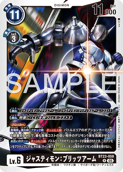Lv.6 ジャスティモン:ブリッツアーム BT23-059 R 究極体 | ワクチン種 | サイボーグ型/フーディエ/CS ≪ブロッカー≫ 【登場時】【進化時】【アタック時】[ターンに1回]バトルエリアのオプションカード1枚を破棄することで、最も登場コストの低い相手のデジモン1体を消滅させる。 【お互いのターン】[ターンに1回]バトルエリアのオプションカードが破棄されたとき、このデジモンをアクティブにする。その後、ターン終了まで、このデジモンは相手のデジモンの効果を受けない。 ---
