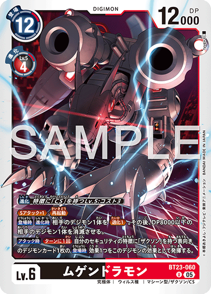 Lv.6 ムゲンドラモン BT23-060 U 究極体 | ウィルス種 | マシーン型/ザクソン/CS ≪Sアタック+1≫≪再起動≫ 【登場時】【進化時】相手のデジモン1体を≪退化1≫。その後、DP8000以下の相手のデジモン1体を消滅させる。 【アタック時】[ターンに1回]自分のセキュリティの特徴に「ザクソン」を持つ表向きのデジモンカード1枚の【登場時】効果1つをこのデジモンの効果として発揮する。 ---