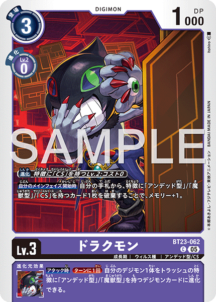 Lv.3 ドラクモン BT23-062 C 成長期 | ウィルス種 | アンデッド型/CS 【自分のメインフェイズ開始時】自分の手札から、特徴に「アンデッド型」/「魔獣型」/「CS」を持つカード1枚を破棄することで、メモリー+1。 --- 【アタック時】[ターンに1回]自分のデジモン1体をトラッシュの特徴に「アンデッド型」/「魔獣型」を持つデジモンカードに進化できる。
