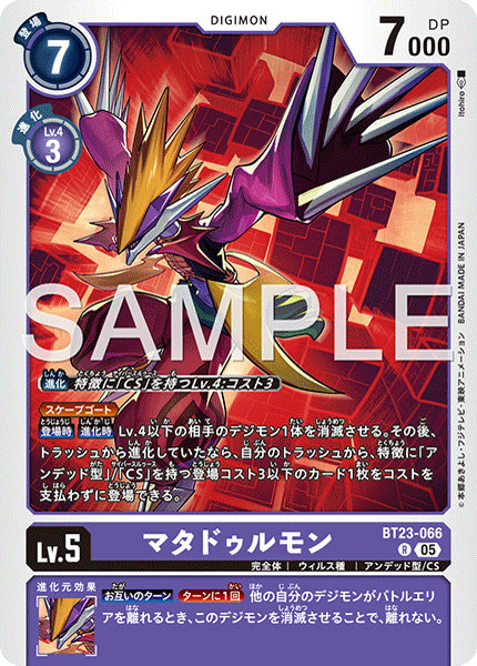 Lv.5 マタドゥルモン BT23-066 R 完全体 | ウィルス種 | アンデッド型/CS ≪スケープゴート≫ 【登場時】【進化時】Lv.4以下の相手のデジモン1体を消滅させる。その後、トラッシュから進化していたなら、自分のトラッシュから、特徴に「アンデッド型」/「CS」を持つ登場コスト3以下のカード1枚をコストを支払わずに登場できる。 --- 【お互いのターン】[ターンに1回]他の自分のデジモンがバトルエリアを離れるとき、このデジモンを消滅させることで、離れない。