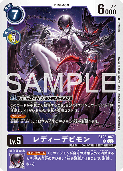 Lv.5 LadyDevimon BT23-067 U Ultimate | Virus | Fallen Angel/CS [Digivolve] Lv.4 w/[CS] trait: Cost 3 When this card would be played from the hand, if you have [Angewomon] or [Mirei Mikagura], reduce the play cost by 3. <Blocker> [On Play] [When Digivolving] Delete 1 of your opponent's level 4 or lower Digimon. --- <Scapegoat> (When this Digimon would be deleted other than by your effects, by deleting 1 of your other Digimon, it isn't deleted.)