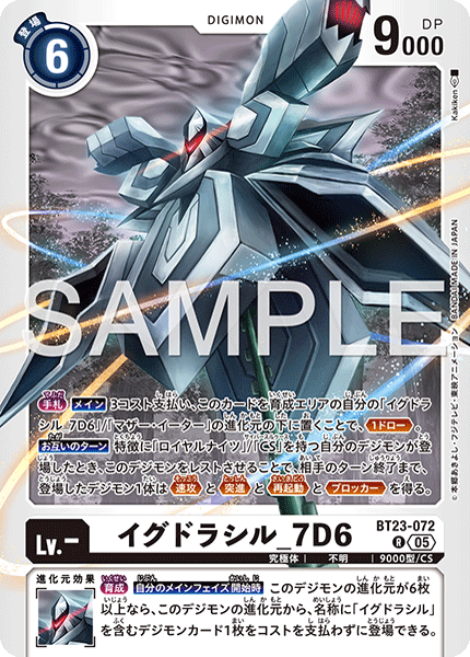 {Breeding} [Start of Your Main Phase] If this Digimon has 6 or more digivolution cards, you may play 1 Digimon card with [King Drasil] in its name from its digivolution cards without paying the cost.- King Drasil_7D6 BT23-072 R Mega | Unknown | 9000/CS [Hand] [Main] By paying 3 cost and placing this card as the bottom digivolution card of your [King Drasil_7D6] or [Mother Eater] in the breeding area, <Draw 1>. [All Turns] When any of your Digimon with the [Royal Knight] or [CS] trait are played, by suspending this Digimon, 1 of the played Digimon gains <Rush>, <Raid>, <Reboot> and <Blocker> until your opponent's turn ends. --- [Breeding] [Start of Your Main Phase] If this Digimon has 6 or more digivolution cards, you may play 1 Digimon card with [King Drasil] in its name from its digivolution cards without paying the cost.