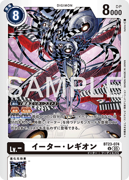 Lv.- Eater Legion BT23-074 U Eater | Hudie/CS [Digivolve] [Erika Mishima]: Cost 3 <Alliance> <Reboot> [On Play] [When Digivolving] If you have [Mother Eater] in the breeding area, you may play up to 6 play cost's total worth of Digimon cards with the [Eater] trait from your hand without paying the costs. --- -