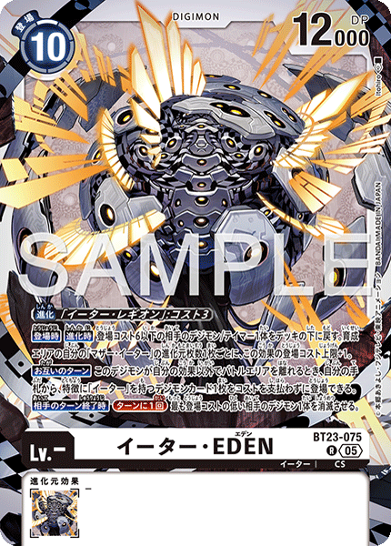 - Eater EDEN BT23-075 R Eater | CS [Digivolve] [Eater Legion]: Cost 3 [On Play] [When Digivolving] Return 1 of your opponent's play cost 6 or lower Digimon or Tamers to the bottom of the deck. For each of your [Mother Eater]'s digivolution cards in the breeding area, add 1 to this effect's play cost maximum. [All Turns] When this Digimon would leave the battle area other than by your effects, you may play 1 [Eater] trait Digimon card from your hand without paying the cost. [End of Opponent's Turn] [Once Per Turn] Delete 1 of your opponent's lowest play cost Digimon.