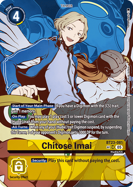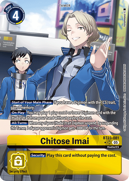 Chitose Imai BT23-081 SR Hudie/CS [Start of Your Main Phase] If you have a Digimon with the [CS] trait, gain 1 memory. [On Play] You may play 1 play cost 5 or lower Digimon card with the [Hudie] trait from your hand without paying the cost. [All Turns] When any of your [Hudie] trait Digimon suspend, by suspending this Tamer, 1 of your opponent's Digimon gets -3000 DP for the turn. --- [Security] Play this card without paying the cost.