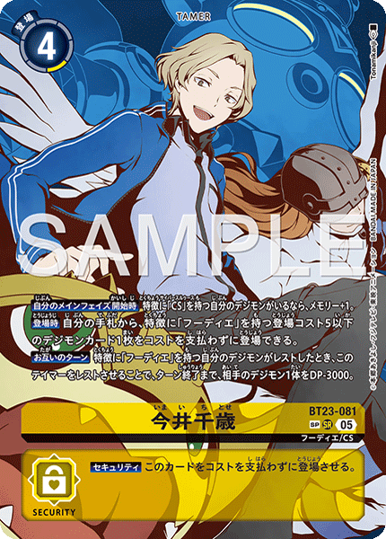 今井千歳 BT23-081 SR フーディエ/CS 【自分のメインフェイズ開始時】特徴に「CS」を持つ自分のデジモンがいるなら、メモリー+1。 【登場時】自分の手札から、特徴に「フーディエ」を持つ登場コスト5以下のデジモンカード1枚をコストを支払わずに登場できる。 【お互いのターン】特徴に「フーディエ」を持つ自分のデジモンがレストしたとき、このテイマーをレストさせることで、ターン終了まで、相手のデジモン1体をDP-3000。 --- 【セキュリティ】このカードをコストを支払わずに登場させる。
