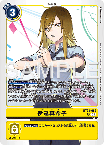 伊達真希子 BT23-082 U CS 【自分のメインフェイズ開始時】相手のデジモンがいるなら、メモリー+1。 【自分のターン】自分のデジモンが特徴に「獣人型」/「聖獣型」/「智天使型」/「CS」を持つデジモンに進化したとき、このテイマーを手札に戻すことで、自分の手札から、「ロップモン」か特徴に「CS」を持つLv.3のデジモンカード1枚をコストを支払わずに登場できる。 --- 【セキュリティ】このカードをコストを支払わずに登場させる。